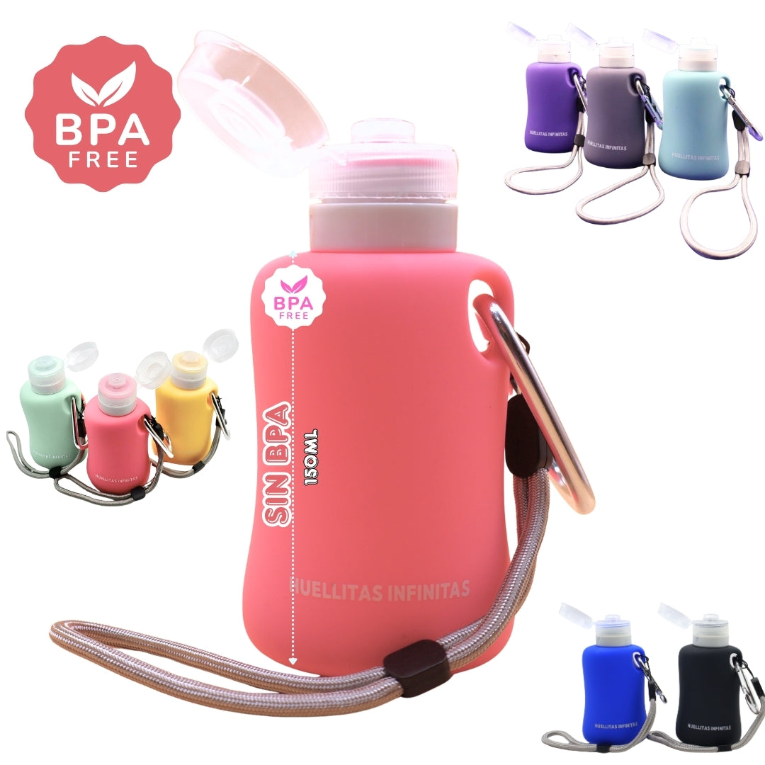 - The bottle system we have created at HUELLITAS INFINITAS has an anti-leak finish on its valve as it is fully embedded in the neck of the bottle so that the cleaning liquid you carry inside never escapes, neither when you are using it nor when you are not, thus avoiding unnecessary uncomfortable inconveniences, this way you can carry it attached to the strap, backpack or accessory itself.