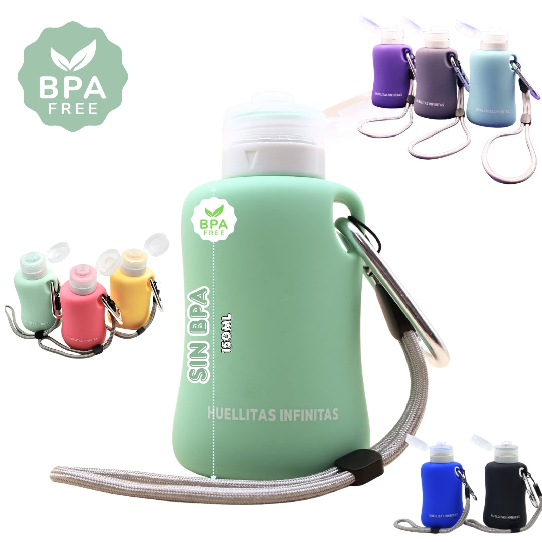 - The bottle system we have created at HUELLITAS INFINITAS has an anti-leak finish on its valve as it is fully embedded in the neck of the bottle so that the cleaning liquid you carry inside never escapes, neither when you are using it nor when you are not, thus avoiding unnecessary uncomfortable inconveniences, this way you can carry it attached to the strap, backpack or accessory itself.