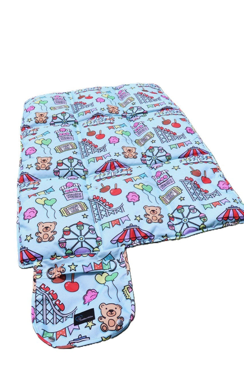 • Diseño alegre y original: Hemos creado un estampado con motivos de nuestras maravillosas ferias (norias, algodón de azúcar, manzanas de caramelo…), sobre un fondo azul vibrante que llenará de color cualquier rincón donde lleves la cama de tu perrete.