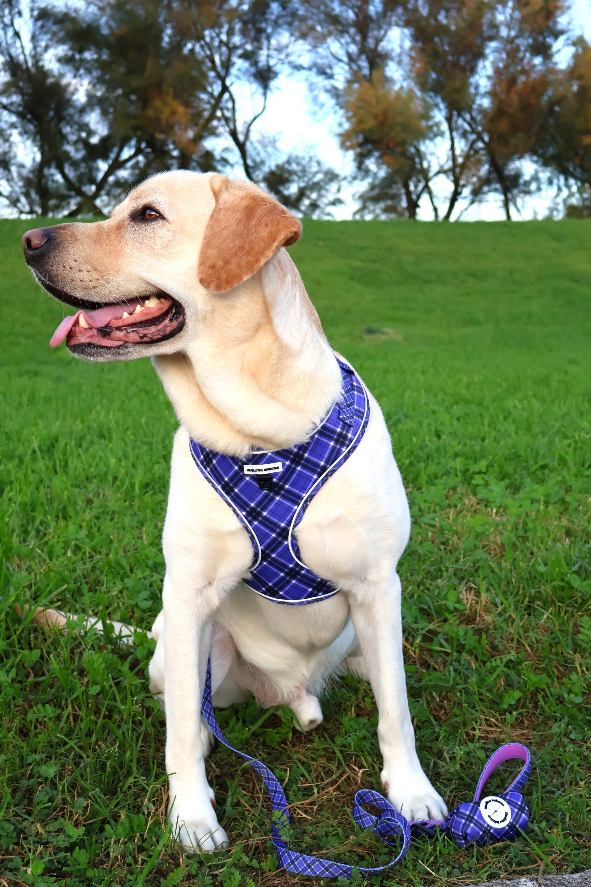 Este arnés destaca por su vibrante diseño a cuadros en tonos morados y azules, combinado con una estructura pensada meticulosamente para el bienestar y el soporte diario de tu compañero peludo en cada paseo.