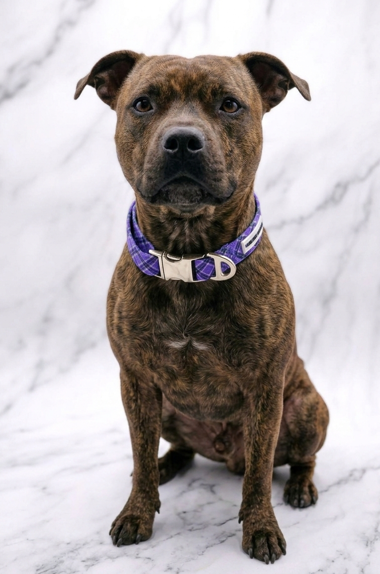 Diseño Exclusivo: Un estampado tartán en tonos lavanda que resalta en cualquier tipo de pelaje, dándole un toque distinguido y moderno.